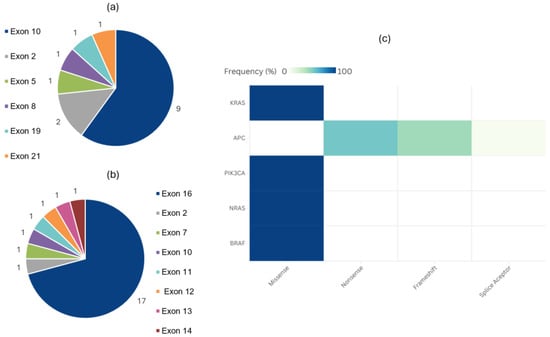 Absolute frequency of PIK3CA (a) and APC (b) variants distributed by affected exon. Heatmap (c) showing relative frequency of variants, classified according to amino acid change, for each of the most commonly altered genes overlapping between the two panels.