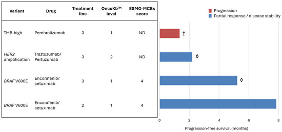 The table (left) presents four patients treated with targeted therapies in subsequent lines of systemic treatment for mCRC. The variant-matched treatment is scored according to its potential clinical benefit using the ESMO Magnitude of Clinical Benefit Scale (ESMO-MCBS) in the non-curative setting and OncoKBTM therapeutic level. The bars (right) display the median progression-free survival (in months) and the best response to treatment: progression (red) or partial response/disease stability (blue). One patient died (†) and two are still on treatment (◊). ND—not defined.