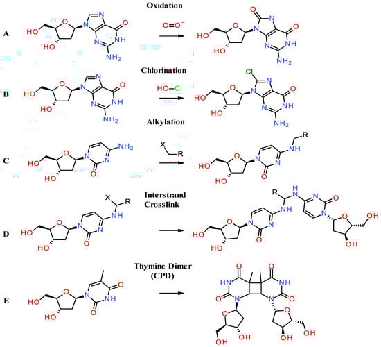 General chemical mechanisms leading to 2′-deoxy nucleoside modifications in vivo and in vitro. (A) Oxidation of 2′-deoxy adenosine by superoxide. (B) halogenation of 2′-deoxy adenosine by hypochlorous acid. (C) Alkylation of cytosine by an alkyl halide. (D) Interstrand or interstrand crosslink of cytosines catalyzed by an alkylated cytosine with a halogen. (E) Thymine dimer induced by UV exposure.