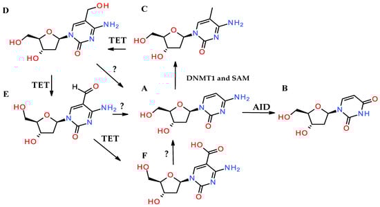 Methylation and hydroxymethylation catalyzed by DNMT1, SAM, and the TET family of proteins. (A) 2′Deoxy-cytosine. (B) 2′Deoxy-uracil formed by deaminating cytosine catalyzed by AID. (C) 5-Methyl-2′deoxy-cytosine catalyzed by DNMT1 and SAM. (D) 5-Hydroxymethyl-2′deoxy-cytosine catalyzed by TET proteins. (E) 5-Formyl-2′deoxy-cytosine catalyzed by TET proteins. (F) 5-Carboxy2′deoxy-cytosine catalyzed by TET proteins.