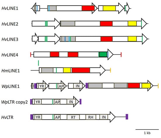 Schematic drawings of putative long interspersed nuclear elements (LINEs) of H. verbana (HvLINE1–4), H. manillensis (HmLINE1) and W. pigra (WpLINE1) and of long terminal repeat (LTR) elements of W. pigra and H. verbana. The size and orientation of open reading frames are indicated by open arrows. Colored marks indicate the position of characteristic sequence motifs like the CCHC motif (green), the RRM motif (dark and light blue), a polyA motif (orange), putative TSDs (red) and LTRs (purple). In addition, the characteristic functional domains of each type of element are indicated.