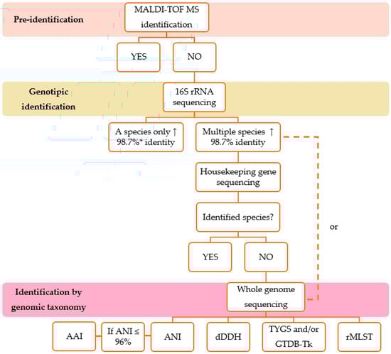 Steps of identification of environmental bacterial isolates, from MALDI-TOF MS to genomic taxonomy analyses. AAI, average amino acid identity; ANI, average nucleotide identity; dDDH, digital DNA-DNA hybridization; GTDB-Tk, Genome Taxonomy Database Toolkit; MALDI-TOF MS, Matrix-Assisted Laser Desorption Ionization–Time of Flight/Mass Spectrometry; rMLST, Ribosomal Multilocus Sequence Typing; TYGS, Type Strain Genome Server, ↑, above. * According to Stackebrandt, Ebbers (2006) [33].