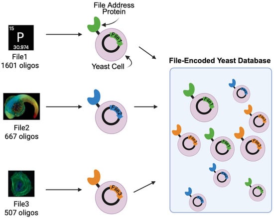 Overview of hybrid DNA information storage system using file address proteins displayed on the surface of yeast. Yeast strains displaying unique file address proteins are transformed with DNA sequences that collectively encode for distinct files. The File1 DNA library consists of 1601 unique sequences and encodes an image of the phosphorus periodic table icon. The File2 DNA library consists of 667 unique sequences and encodes an image of a zebrafish embryo. The File3 DNA library consists of 507 unique oligos and encodes an image of a muscle cell []. Created in BioRender. Lee, M. (2025), https://BioRender.com/p35xx0d (accessed on 7 July 2025).