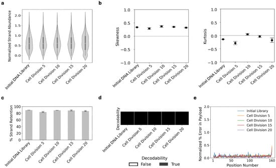 An important first consideration for any data storage system is its fidelity over time or over repeated data access. For DNA, the highest risks to data fidelity are mutations or loss of specific sequences or strands of DNA due to chemical or physical manipulation []. These risks arise in vitro when DNA strands are copied through enzymatic processes like polymerase chain reaction, and they arise in vivo when cells recombinantly assemble the file-encoded DNA and use DNA polymerase to copy their DNA during cell division. To assess these risks, we transformed yeast with the 507 DNA sequences that altogether encode for File3, an image of a muscle cell (Figure 1). The encoding process is shown in Figure S1. We then cultured the yeast population for 20 cell divisions, harvesting DNA every five cell divisions. Next-generation sequencing (NGS) of the extracted DNA revealed that multiple important parameters of file fidelity were maintained. The normalized strand abundance, a metric describing the spread of the distribution of the DNA library, remained at a log-transformed median of ~0.6 copies per strand through all cell divisions with mutually similar violin plot morphologies (Figure 2a, Equation (S4)). The strand distributions also remarkably matched that of the initial synthesized DNA library prior to transformation into yeast. Each distribution displayed a normal skew (skew = 0.33; 0.28; 0.37; 0.35; 0.32) and mesokurtosis (excess kurtosis = −0.14; −0.28; 0.044; −0.0; −0.18) (Figure 2b).