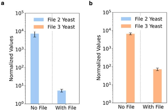 Transformation of yeast with file DNA partially impacts display efficiency but not labeling specificity. (a) The MYC epitope tag specifically labeled File2 (b) and the FLAG epitope tag specifically labeled File3. Yeast with and without transformed file DNA were compared. The normalized fluorescence values were calculated from the median values of the fluorescence populations using Equations (S1) and (S2), with error bars representing the standard error. Replicates were three different yeast inductions.
