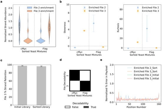 After demonstrating that the transformed yeast strains preserved their address specificity, we mixed the File2 and File3 yeast populations and attempted to access each file specifically by sorting the yeast using antibodies against each displayed epitope tag. To access each file specifically, an anti-MYC or anti-FLAG antibody-bound Protein A magnetic bead was incubated with the yeast database. Bound yeast were magnetically extracted, grown for 48 h, and then magnetically sorted another time []. File DNA was then extracted from the sorted yeast and submitted for NGS. The NGS data indicated that File2 and File3 were successfully enriched from the MYC- and FLAG-sorted populations, respectively (Figure 4a). The strand abundances for the targeted files displayed normal skews (skew values = −0.35; −0.23) and mesokurtosis (excess kurtosis values = −0.77; −0.05) (Figure 4b). Moreover, the strand diversity was retained at a high level with almost 100% of the unique sequences retained for File3 (Figure 4c) and ~80% of the unique sequences retained for File2 (Figure S3). Both File2 and File3 were also decodable (Figure 4d), while the unwanted file was not decodable. In addition, the sorting process did not introduce any additional errors (Figure 4e and Figure S4).