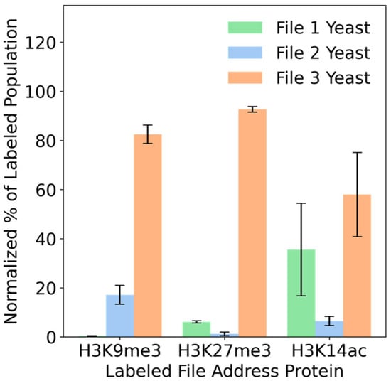 We found that the H3K9me3 peptide was able to label File2 and File3 from the database (Figure 5). The H3K27me3 peptide labeled File1 and File3, and the H3K14ac peptide labeled all three files. These unique combinations therefore enable the use of one histone peptide to extract combinations of multiple files.