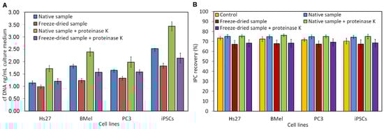 Optimization of cfDNA extraction. Panel (A) shows the concentration of extracted circulating cell-free DNA (cfDNA), expressed in ng/mL of culture medium, as measured by the Qubit® 4.0 Fluorometer (Thermo Fisher Scientific). Culture media (native) from normal human dermal fibroblasts (Hs27), human induced pluripotent stem cells (iPSCs), human melanoma cells (BMel), and human prostate adenocarcinoma cells (PC3) were collected after 24 h of growth and lyophilized at −40 °C using an SJIA-18N laboratory freeze-dryer (Ningbo SJIA Instrument Co., Ltd., China). For each condition, native (2 mL) and lyophilized (400 µL) samples were either treated or untreated with 200 µg/mL Proteinase K (Norgen, Birmingham, UK) and incubated for 20 min at 37 °C prior to cfDNA purification. cfDNA was extracted using the PureLink™ Quick Gel Extraction Kit (Invitrogen, Waltham, MA, USA) across all conditions (native, lyophilized, native + Proteinase K, lyophilized + Proteinase K). Panel (B) shows the recovery percentage (%) of the spiked IPC oligo across all cell lines and extraction conditions. Recovery rates were quantified by qPCR using FORW_IPC and Reverse_IPC primers. Data are presented as means ± SD (n = 3).