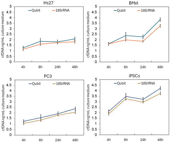 Quantification of cfDNA using Qubit and 18SrRNA gene amplification. The graph shows the concentration of cfDNA (expressed as ng/mL of culture medium) extracted from the Hs27, iPSC, BMel, and PC3 cell lines at different incubation times (4, 8, 24, and 48 h). cfDNA was isolated from culture supernatants using the PureLink™ Quick Gel Extraction Kit (Invitrogen), with prior Proteinase K pretreatment. Quantification was performed using the Qubit® 4.0 Fluorometer (Thermo Fisher Scientific) and through amplification of the 18SrRNA gene with the primers FORW_18SrRNA and REV_18SrRNA_61. Each concentration value represents a minimum of three biological replicates and three technical replicates. Data are presented as means ± SD (n = 3).