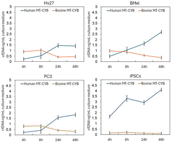 Quantification of cfDNA through amplification of human and bovine MT-CYB genes. The graph shows the cfDNA concentration (expressed as ng/mL of culture medium) extracted from the Hs27, iPSC, BMel, and PC3 cell lines at different incubation times (4, 8, 24, and 48 h). cfDNA was isolated from culture supernatants using the PureLink™ Quick Gel Extraction Kit (Invitrogen), with a prior Proteinase K pretreatment. Quantification was performed by amplifying the human and bovine MT-CYB genes using the primers FORW_CYB/REV_CYB_110 and FORW_CYB_Bovine/REV_CYB_Bovine, respectively. Each concentration value represents a minimum of three biological replicates and three technical replicates. Data are presented as mean ± SD (n = 3).
