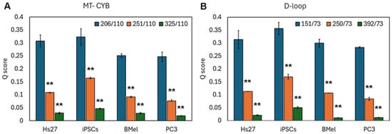 Consistent trends in Q-scores were observed for both the MT-CYB gene and the D-loop region. As shown in Figure 4A,B, Q decreased significantly (p < 0.01) in all cell lines when longer fragments were used in the ratio (e.g., Q325/110 and Q251/110 for MT-CYB; Q392/73 and Q250/73 for the D-loop region).