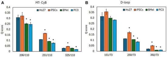 Q-score versus cell lines. The graphs display the Q-scores calculated across all cell lines (Hs27, iPSC, BMel, and PC3) for the human MT-CYB gene (A) and the D-loop region (B). The Q-score is defined as the ratio of the copy number of the largest amplicon to that of the smallest. qPCR amplification of the MT-CYB gene and the D-loop region with specific primers FORW_CYTB, REV_CYTB_110, REV_CYTB_206, REV_CYTB_251, REV_CYTB_325, and FORW_D-loop; REV_D-loop_73, REV_D-loop_151, REV_D-loop_250, and REV_D-loop_392 yielded amplicons of varying sizes: 110, 206, 251, 325 bp for MT-CYB and 73, 151, 250, and 392 bp for the D-loop, respectively. Copy numbers of the different amplicons were determined using standard curves, as described in Section 2. Data are presented as mean ± SD (n = 3). Statistical significance was assessed using Student’s t-test, with comparisons made relative to the normal cell line Hs27. * p < 0.05.