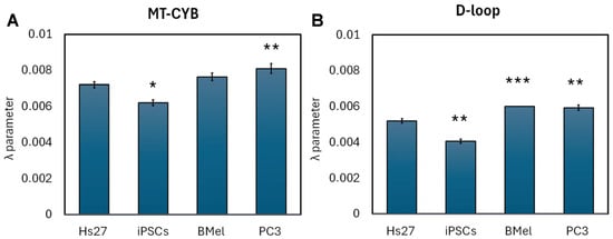 λ Parameter versus cell lines. The figure shows the λ parameter calculated for the MT-CYB gene (A) and the D-loop region (B) at 24 h of growth in all analyzed cell lines (Hs27, iPSC, BMel, and PC3). qPCR amplification of the MT-CYB gene and the D-loop region with specific primers—FORW_CYTB, REV_CYTB_110, REV_CYTB_206, REV_CYTB_251, REV_CYTB_325, FORW_D-loop, REV_D-loop_73, REV_D-loop_151, REV_D-loop_250, and REV_D-loop_392—produced amplicons of different lengths: 110, 206, 251, and 325 bp for MT-CYB and 73, 151, 250, and 392 bp for the D-loop, respectively. The copy numbers of the various amplicons were determined using standard curves constructed as described in Section 2. By plotting the logarithm of the copy number against the fragment size, λ was obtained as the slope of the linear regression line. Data are presented as mean ± SD (n = 3). Statistical significance was assessed using Student’s t-test, with comparisons made relative to the normal cell line Hs27. * p < 0.05; ** p < 0.01; *** p < 0.001.