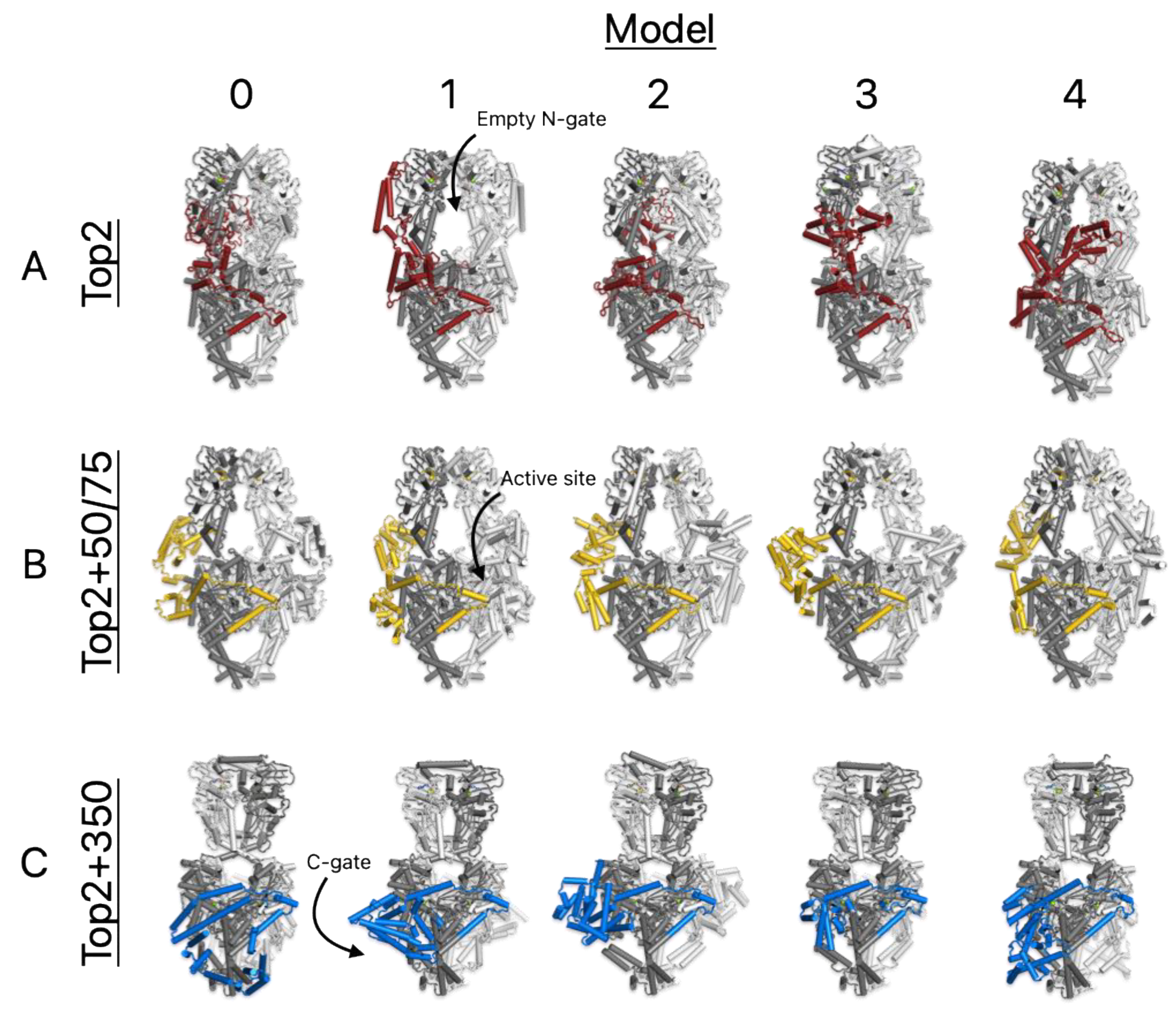 - Endsley, C.E.; Moore, K.A.; Townsley, T.D.; Durston, K.K.; Deweese, J.E. Bioinformatic Analysis of Topoisomerase IIalpha Reveals Interdomain Interdependencies and Critical C-Terminal Domain Residues. Int. J. Mol. Sci. 2024, 25, 5674. [Google Scholar] [CrossRef] [PubMed]