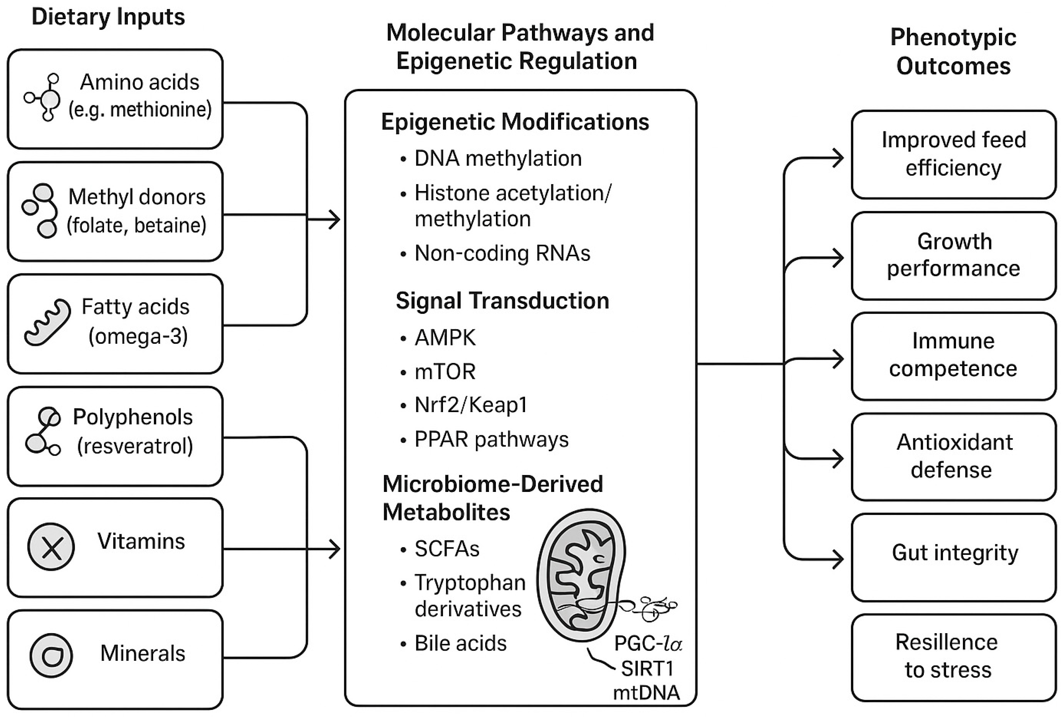 92]. Another important frontier is epigenetic programming, wherein targeted dietary interventions during critical developmental windows, such as embryogenesis, early post-hatch periods, or through maternal feeding, can induce stable epigenetic modifications, including DNA methylation, histone acetylation, and non-coding RNA expression [