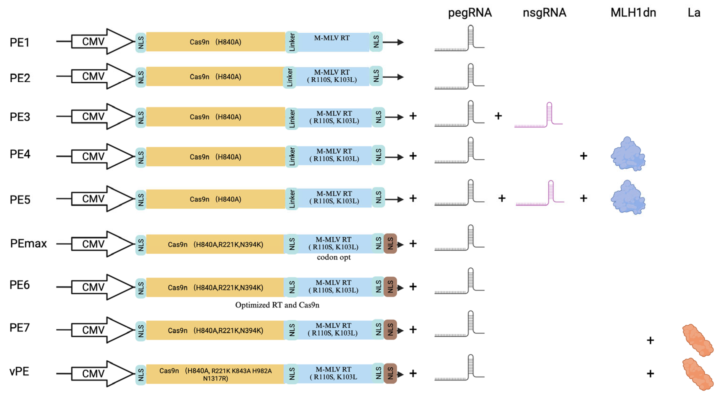 | PE6 [4] | Optimization of Cas9 and RT based on PEmax | 23-fold compared to PEmax△RNaseH | PE6a to PE6d, which offered improvements in editor size (PE6a and b) and RT activity (PE6c and d); PE6e–g were based on using various evolved and engineered Cas9 variants. |