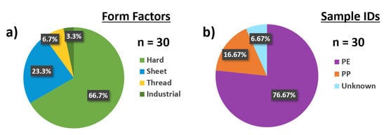Distributions of sample identities and form factors: (a) form factor distribution of the 30 plastic pieces sub-sampled for characterization as part of this study [13]; (b) sample type distribution (PE, PP or unknown) of the plastic pieces evaluated.