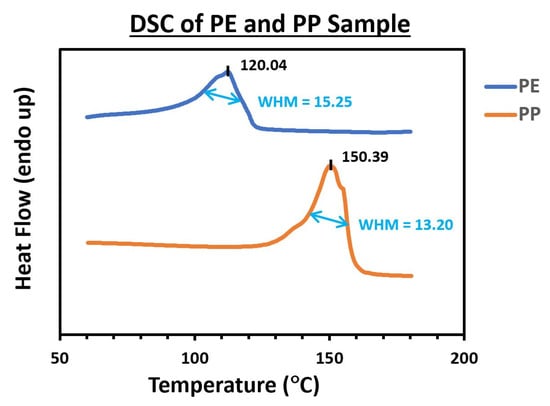 Example DSC endotherms of samples identified as PE and PP. The peak melting temperature for hatchling-extracted PE sample melts at ~120.0 °C. The PP sample melts at 150.4 °C. WHM indicates the melting peak width at half-max. In both cases, the endotherm contours for both samples are rather broad, with an extended low melting point tail.