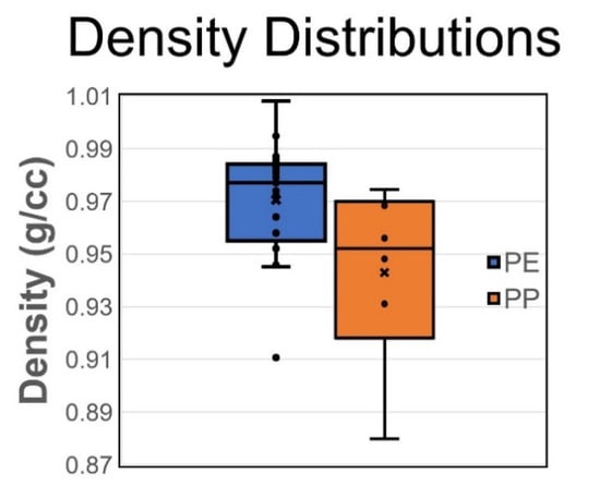 The pycnometry results ranged from 0.88 to 1.008 g mL−1 (Supplementary Table S1) and are shown in the box and whisker plots in Figure 4, fractionated by those most likely to be PE and those most likely to PP, representing 28 of the 30 measured samples. The resolved average densities were 0.970 g mL−1 for PE and 0.943 g mL−1 for PP and the ranges encapsulated by the upper and lower quartiles of each were 0.955–0.984 and 0.918–0.970 g mL−1, respectively. The densities for both sets were higher than anticipated, particularly for PP, with an expected density range in the order of 0.895–0.92 g mL−1 [21]. One plausible rationale is that suppliers often add fillers such as calcium carbonate, chalk or some other valueless mass to decrease the material cost by improving the efficiency of the resin usage.