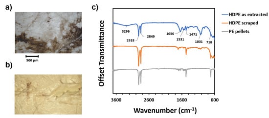 PE sheet sample reanalyzed with FTIR after having biofilm residue scraped from the surface. This sample was identified as HDPE based on density assessments: (a) micrograph of surface as extracted; (b) micrograph of surface after scraping biofilm (~1 mm below the surface) with a razor; (c) corresponding FTIR spectra of the as-extracted and scraped samples compared alongside standard PE pellets.