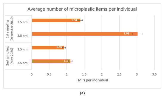 Instead, there were no statistically significant differences in the average number of microplastics between the sampled mussels at 2.5 and 3.5 nmi from the coast. Therefore, the average number of microplastics per individual was similar between each mussel sampling station (Mann–Whitney test, p value > 0.05).