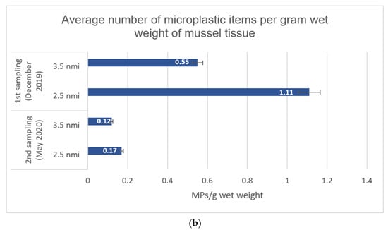 In May 2020, the total amount of microplastics observed in the mussels collected along the two stations was generally lower than what was observed during the first survey, with concentrations of 0.17 ± 0.21 and 0.12 ± 0.13 microplastic items per gram wet weight of mussels’ tissue at 3.5 and 2.5 nmi, respectively, from the coast (Figure 3).