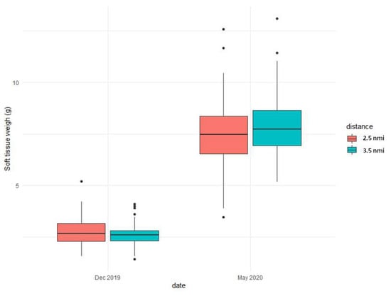 The box plot describes the mean values of microplastic particles per gram wet weight of mussels’ tissue as a function of distances from the coast (at 2.5 and 3.5 nmi) and sampling period (December 2019 and May 2020), underlining the significant differences between the two time samplings.
