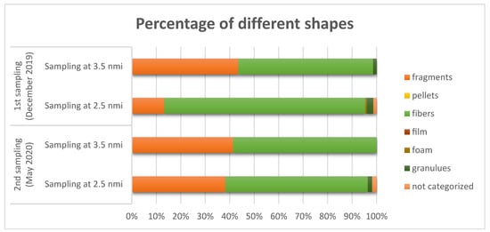 Fiber particles were the most abundant shape (50–80%), followed by fragments (10–40%). In contrast, granules (1.5–2.5%), non-categorized shape (1–2%) and foam (<1%) accounted for less than 2.5% or were not detected (Figure 5).