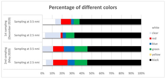 Although the most common color among all the encountered MPs was black (50–70%), microplastics particles were also found to be transparent (5–15%), red (2–15%), green (5–13%), white (2–13%) and blue (2–10%) (Figure 6).