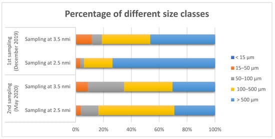 Microplastics were classified into five size categories (<15 µm, 15–50 µm, 50–100 µm, 100–500 µm and >500 µm). In the samples collected in the 1st sampling (December 2019), microplastics of >500 µm were the most abundant size class, 73.51% and 46.38%, respectively, at 2.5 and 3.5 nmi from the coast. Instead, the intermediate size class (100–500 µm) made up 54–35% of the microplastic items found in the 2nd survey (May 2020). The size class frequency distribution of the isolated MPs is presented in Figure 7.