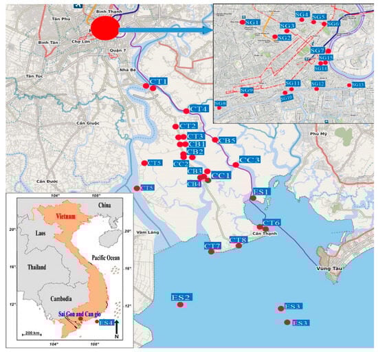 Geographical map of Vietnam, study areas and sampling locations. SG stands for Saigon, another name of Ho-Chi-Minh City, CT stands for Can Gio Mangrove—Transition zone, CB stands for Can Gio Mangrove—Buffer zone, CC stands for Can Gio Mangrove—Core zone, ES stands for East Sea, a name by the Vietnamese people for South China Sea. The detailed location names are found in Table S1 in Supplementary Materials.