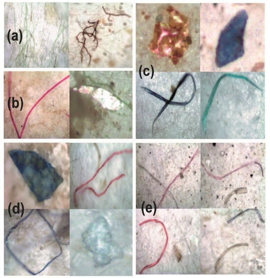 Non-microplastics and microplastics extracted from the marine environment of Southern Vietnam: non-microplastic fibers (a); microplastics in Saigon urban canals (b), Can Gio (c), Ganh Rai (d), White Tiger oilfield (e).