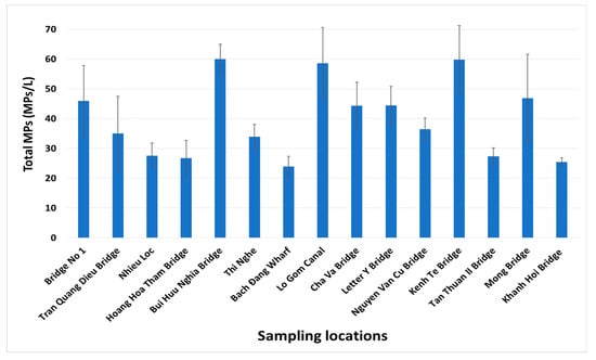 Figure 3 showed the uneven distribution of microplastics in locations of Ho Chi Minh City. The microplastic amount was highest in residential areas, 45.89 ± 24.04 MPs/L in Bridge No. 1 (SG1 on the map, Figure 1) where floating rubbish from NL-TN canal was gathered, varied from 44.33 to 58.57 MPs/L in Tau Hu Canal (SG8, SG9, SG1, SG11) belonging to Districts 6, 7, 8 and Tan Binh. Microplastics were found with a noticeably high abundance in some samples at the locations where the water environment was concentrated (dark color) with a higher number of visible floating garbage such as food boxes, clothing pieces and nylon bags. Among the repetition times, there were replicates obtaining a very high abundance of plastic debris, for instance, 160 MPs/L in Bridge No. 1 (SG1, Figure S1a), 110 MPs/L in Letter Y Bridge (SG10), 125 MPs/L in Lo Gom canal (SG10), and 220 MPs/L in Kenh Te Bridge (SG12). There was a dramatic decrease in the microplastic amount from the pollution sources to Saigon River estuaries, for example, 23.92 ± 19.23 MPs/L in Bach Đang Wharf (SG7), and 27.33 ± 6.23 MPs/L in Khanh Hoi Bridge (SG15). Indeed, Tukey’s multiple tests showed significant statistical differences between Kenh Te Bridge and Khanh Hoi (Sig. = 0.005, Table S4), and Bach Dang Wharf (Sig. = 0.021, Table S4). There were no statistical differences between other locations.
