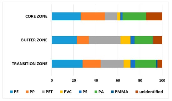 Figure 4 indicates the distribution of plastic types in the zones of the Can Gio reserve. PE was the most abundant type in the transition and core zones, and almost all of it was in the form of fragments and particles. PET was the largest group in the form of fibers (35%) and fragments (35%) in the buffer zone but was the second-most dominant, mainly in fibrous form (53.57%) in the transition zone and in both fibers (31.25%) and particles (31.25%) in the core zone. Fibers were found to be abundant in the transition zone, especially in coastal locations. Can Gio 30 April Beach is the most attractive recreational beach, which is considered a vital pollution source, especially of polyamide fibers [60]. Fishing is the main income source of the local people, especially in Can Thanh. Zhu et al. [41] proposed that the origin of blue nylon fibers is cables used in fishery activities. Moreover, fibers could originate from shipping [61], especially at the intersection of main rivers—Đong Tranh and Long Tau, where large ships circulate every day. In addition to plastics’ density at this location, the buoyancy effects of marine plastics in the water column were mediated by a high level of surface mixing caused by boat movement and seawater turbidity [34]. As a result, PET and PA dominated (26.53%), followed by PP (20.41%) and PE (10.2%).