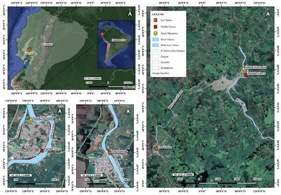 The Guayas province is located on the central-western coast of Ecuador with a population of 3,573,003 inhabitants and an area of 18,661.69 km² [32]. Its hydrographic network is formed by the Guayas Basin, which extends across 36,000 km² [33]. Various rivers merge to form the Guayas River, the most important river in this province. The Guayas estuarine system is highly productive due to upwelling caused by the Humboldt current [34] and is one of the largest estuarine basins in Ecuador, covering an area of 33,700 km2 [35]. Towards the north of Guayaquil city, the Daule (receiving waters from Pueblo Viejo, Vinces, Zapatal, and Yaguachi) and Babahoyo (with San Pablo and Caracol affluents) rivers merge to form the Guayas River [36], which ultimately flows into the Pacific Ocean [37]. An important tributary within this hydrographic network is the Vinces river; it contributes to the supply and irrigation of crops and is the first freshwater beach resort in Ecuador [38].