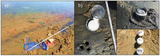 Firstly, a 40–50 m transect line was laid out along the water’s edge (strandline) at each site. Three replica samples were collected at all three stations per site: both ends and at the centre of the transect, recording GPS coordinates at each station. The samples were collected approximately 1 m from the strandline by pushing a 5 mL glass bijoux jar into the sediment, which acted as a miniature corer and was then sealed with a metal screw cap (Figure 2). The most representative accumulations of microplastics were sampled within the top 3 cm of sediment. This methodology was based on a study also sampling MP in sediment [3].
