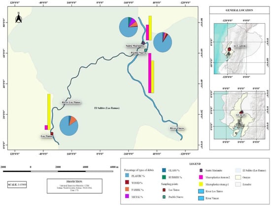 In 2010, the National Program of Integrated Solid Waste Management (PNGIDS) was developed, aiming at promoting integrated and sustainable solid waste management throughout the 221 municipalities in Ecuador [28]. This program was enforced by the Ministry of the Environment (MAE) and is regulated through the Constitution of Ecuador [29] and the Organic Code of the Environment [30]. Despite these efforts, only 24% of the country’s municipal governments are separating waste, thus giving a clear indicator of economic unsustainability [31]. However, there is limited information on the composition and distribution of macro and microplastics in rivers, especially in the lower basins and estuarine areas of the coast of Ecuador. Therefore, this research was focused on determining the composition, abundance and distribution of MAPs and microplastics in a section of the Vinces and Los Tintos rivers in the Guayas province, to generate a baseline of contamination in fresh water sources in Ecuador.