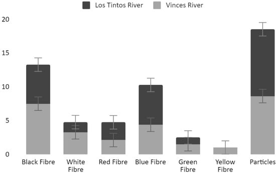 In Los Tintos River, recovered MPs were found in a variety of colours including black, white, red, blue and green (Figure 5). These colours, including yellow, were found in Vinces River. This river accounted for 38% of black microfibres, making them the most abundant colour. Los Tintos river identified an abundance of 35% blue and 34% black fibres (Figure 5 and Figure 6).