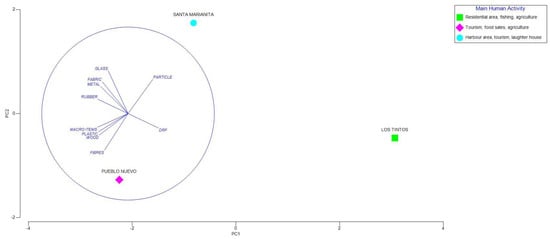PCA analysis showed a clear difference between the studied sites. Two principal components account for 100% of the data variance. (Figure 7). The first component (PC1) explained 75.6% of the data variability, and the variables with higher incidence were macro items, rubber, direction of river flow and plastics (MAPs). The second component (PC2) explained 24.4% of the data variability and was positively correlated with glass and particles and negatively correlated with fibres (Figure 7).