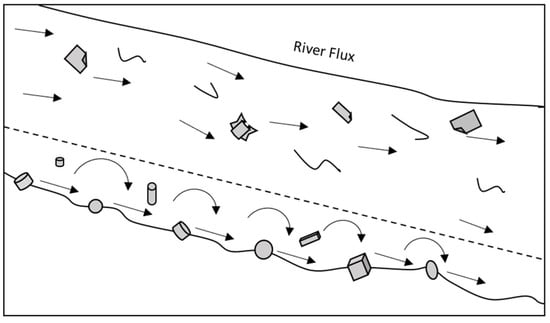 Significant quantities of microplastics have been reported along riverbeds around the world, suggesting that rivers function not just as pathways but also as potential pools of plastic microparticles [72]. Under the influence of changing water currents, due to seasonality, for instance, deposited plastic particles on riverbeds can either return to the water column mobilized by the water flow or stay still settled [70]. On the other hand, floating plastic particles would respond in a different way under the same hydrodynamic conditions (Figure 4). However, deeper research on the diffusion of varied microplastic types in river sediments is scarce.