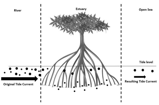 With their highly complex hydrodynamics, estuaries can act as natural filters to selectively trap particles [84]. The efficient trapping character of estuarine environments is due, in part, to the existence of many macrophyte or mangrove plant species that contribute to decreasing the current flux across the aquatic compartment. Especially in some spots of the estuary, the smaller transport competence stimulates floating particles to decant and accumulate in the fine-grained muddy bottom (Figure 6). Some authors suggested that typical estuarine flora together with tide fluxes work as potential microplastics retainer within estuarine systems [93,94]. For instance, mangrove forest specimens, presenting their pneumatophores, promote the current blockage, stimulating the accumulation of microplastic particles in sediments. Since the decantation of plastics is size dependent, small plastic particles tend to sink downward to the estuarine floor, while larger particles preferentially stay afloat in surface waters for a longer period [95].