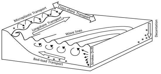 Gradually, as waves approach the shallow coastal water, the bottom increasingly imposes wave transformations (shoaling and refraction) (Figure 7), reflecting the velocity drift and direction of wave propagation known as the Stokes drift [125]. This effect is stronger in the upper water layers, decreasing along the water column, even resulting in opposite currents near the bottom (i.e., offshore drift). In addition to these nearshore current systems, water turbulence resulting from wave breaking in the swash zone causes intense sediment mobilization within the surf zone. So, in the surf zone, sediment can be transported in three ways: as bottom drag, in suspension, and by sheet flow movement [126]. As the characteristics of plastic microparticles differ from those of natural sediments, these elements react to these hydrodynamic processes and wave-induced flow forces similarly but not completely identically to natural sediments. Forsberg et al. (2020) [123] performed a modeling assay and found that heavier plastic particles are expected to present similar diffusion patterns such as natural sand, preferentially accumulating in the breaking zone. Still, the same authors suggested that lighter microplastic particles are more effectively moved by onshore or offshore winds, being more easily exported to other environments such as the open sea or back to the continent.