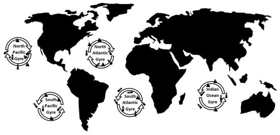 Eriksen et al. (2014) [128] suggest that there are more than five trillion plastic pieces floating in the oceans, representing more than 250,000 tons of plastic circulating. Once at the open sea, the distribution of plastic microparticles through the water column, unlike the floating particles, presents a greater complexity in its distribution, which aroused the curiosity of the scientific community. According to Kanhai et al. (2018) [129], there is a vertical pattern distribution, between 8 and 4369 m depth, in the Arctic Central Basin. Through their investigations, the authors recorded an increase in fragments in the mixing layer depth. Wind currents and geostrophic circulation participate in this stratification process, resulting in patterns that determine convergent zones of particles located in the so-called “subtropical gyres” [130,131] (Figure 8). Kukulka et al. (2012) [44] suggested the great influence of the wind in the turbulence mixing zone, confirming the influence of hydrodynamic cells on the distribution of plastic microparticles. Still, the particular physical features of microplastics make the microplastic vertical distribution through the variable advective flux even more complex [132], which, in turn, impacts the vertical distribution of these particles. Enders et al. (2015) [97] evaluated the vertical diffusion of microplastics in open sea water through the water column and confirmed that, in the same way as in other aquatic environments, vertical dispersion is directly impacted by particle size. According to the authors, larger-sized plastic microparticles are significantly less impacted by turbulent mixing. On the other hand, according to a flux modeling study, fibrous-shaped microplastics present a lower speed, followed by sheets and three-dimensional particles [52].