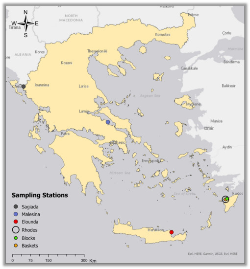 The study included five stations with bivalve populations from four areas in Greece (Figure 1): Sagiada station in the northern Ionian Sea codenamed “Sagiada”, Malesina station in North Evoikos Gulf codenamed “Malesina”, Elounda Bay station in Crete codenamed “Elounda”, and two stations in northern Rhodes in the Aegean Sea codenamed “Rhodes-baskets” and “Rhodes-blocks”.