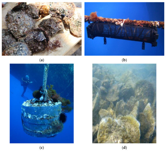 (a) Collected P. imbricata radiata within SEAPA© baskets, (b) P. imbricata radiata farmed in SEAPA© baskets near to the fish cages, (c) Blocks from where samples of P. imbricata radiata were collected in Rhodes, and (d) P. imbricata radiata individuals from the seabed of Elounda bay.
