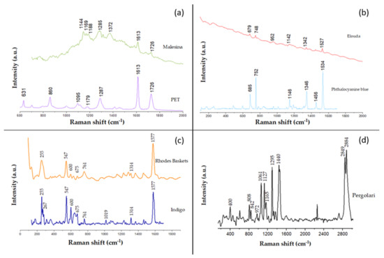 Raman spectra of microfibers. (a) Sample from Malesina station (green line) in comparison with a reference of PET, from our personal library (purple line). (b) Sample from Elounda station (red line) and the pure phthalocyanine blue, for reference (light blue line). (c) Sample from Rhodes-baskets station (yellow line) and pure indigo (blue line) for comparison. (d) Sample from pergolari with characteristic Raman bands correspond to PE and PP.
