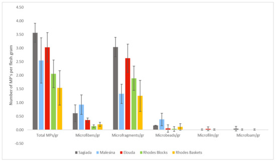 For the comparison between stations, we used P. imbricata radiata specimens collected from the five different sampling stations of the study (shown from west to east in Figure 6). The total MP particles per gram of soft tissue of P. imbricata radiata for Sagiada station were 3.56 ± 0.35, for Malesina station they reached 2.55 ± 0.83, for Elounda they were 3.03 ± 0.54, for Rhodes-blocks they were 2.06 ± 0.51, while for Rhodes-baskets they were 1.54 ± 0.63 (Figure 6). ANOVA results confirmed that there were significant differences in total MPs, microfiber, microfragment, and microbead categories between the five stations of the collected samples (F = 3.652, p < 0.05, F = 7.672, p < 0.05, F = 5.095, p < 0.05 and F = 5.122, p < 0.05, respectively). The dominant type of MP at all sampling stations was microfragments (Figure 6), and consequently they affected the overall pattern of total MPs.