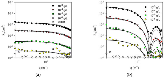 We tested the limitations for static and dynamic light scattering measurements of the equipment used in this study with monodisperse polystyrene latex particles with d = 0.2 µm and d = 0.5 µm. Figure 1 shows Rθ as a function of q for the aqueous latex suspensions at C = 10−3, 10−4, 10−5, and 10−6 g/L. For comparison, we also show the results for pure Milli-Q water. The dashed lines in Figure 1 represent fits to Equations (1) and (2) with d = 0.2 µm and d = 0.50 µm, whereas the solid lines represent fits to the Mie theory [26]. The Rayleigh-Gans approximation (Equation (1)) gave similar results for the smaller particles, but the Mie theory described the experimental results better for the larger particles at higher q-values. The experimental value of Rθ for pure water found in this investigation is in good agreement with the value reported in the literature [30] and is shown for comparison in Figure 1a.