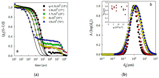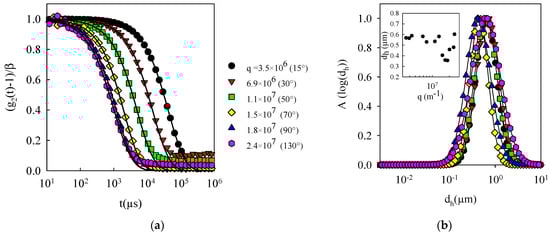 (a) Normalized intensity autocorrelation functions at different scattering wave vectors (q(m−1)) obtained for suspensions of latex particles with d = 0.5 µm at C = 10−5 g/L. The corresponding scattering angles are indicated in brackets. The solid lines represent the fit results to Equation (5). (b) Distributions of the hydrodynamic diameter corresponding to the fit results shown in (a). The inset shows the z-average hydrodynamic diameter as a function of q. Please note that the symbols and colors in (b) is same as (a).