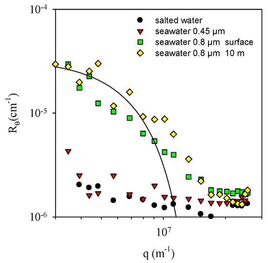 The capacity to detect and characterize colloidal nanoplastics in seawater was tested by investigating samples of seawater. The seawater was filtered through 0.8 µm or 0.45 µm pore size filters in order to assess the presence of particles smaller than 0.8 µm and smaller than 0.45 µm separately. This is necessary because the presence of a small number of large particles can hide the light scattering signal from small particles. Figure 4 shows the q-dependence of Rθ in comparison with that of Milli-Q water to which sea salt was added at the concentration found in the sea. As expected, adding sea salt caused a small increase in the scattering intensity with respect to pure water, as shown in Figure 1 [30].